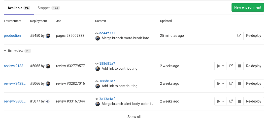 In this case, if you visit the Environments page and the branches exist, you should see something like: