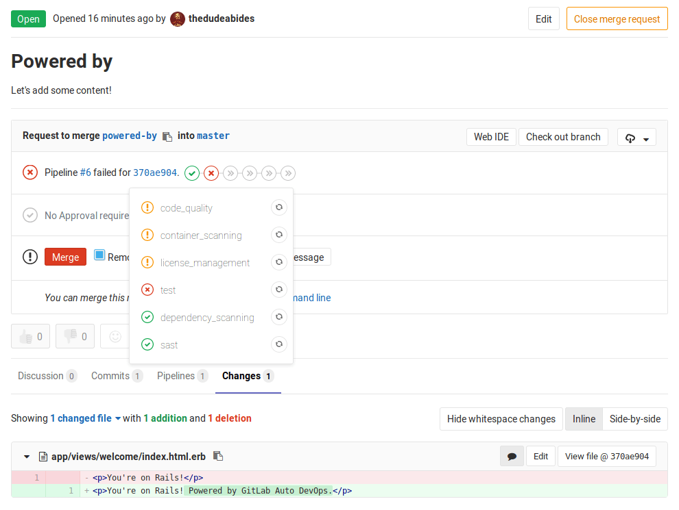 Now, if you go back to the merge request you should not only see the test passing, but also the application deployed as a review app. You can visit it by following the URL in the merge request. The changes that we previously made should be there.