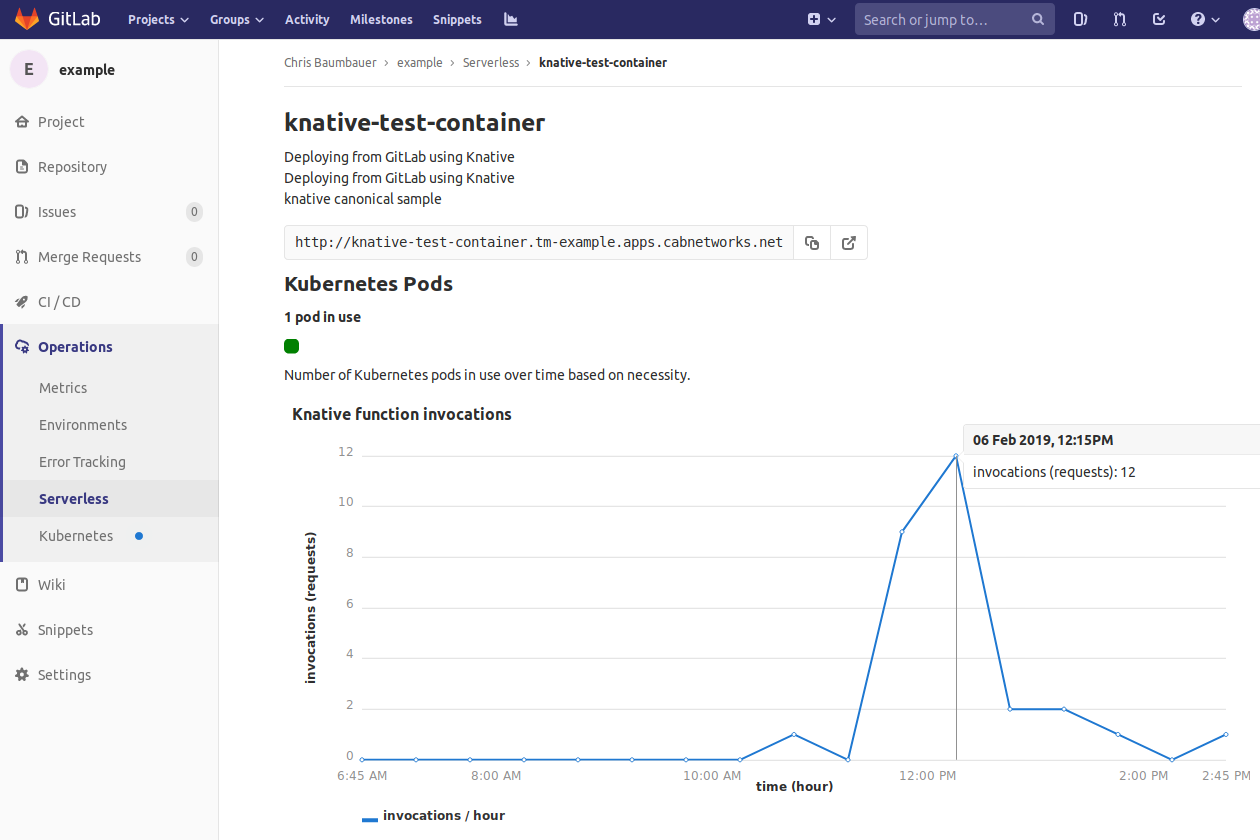 With all the pieces in place, the next time a CI pipeline runs, the Knative application will be deployed. Navigate to CI/CD > Pipelines and click the most recent pipeline.